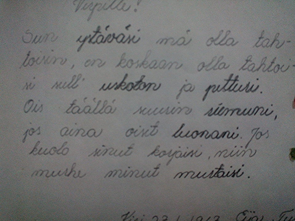 Kirjoittaneet olivat tietysti äidin ystäviä, sisaruksia ja elämän aikuisia vanhemmista opettajaan. Minäkin nautin tutkia juuri koulun aloittaneiden enojen piirrustuksia ja käsialaa. Sillä käsialalla kaikki olivat kirjoittaneet.