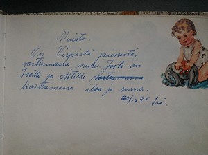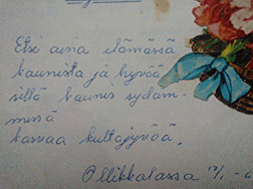 Edellisen käsiala-asiaa ihmettelevän kirjoituksen jälkeen äitini esitteli minulle mummon jäämistöstä löytyneen muistokirjan. Äiti oli noin kymmenvuotias, kun hän keräsi värssyjä, kiiltokuvia ja piirroksia. Hänellä ei ollut aavistustakaan, että mummo oli laittanut kirjan talteen.